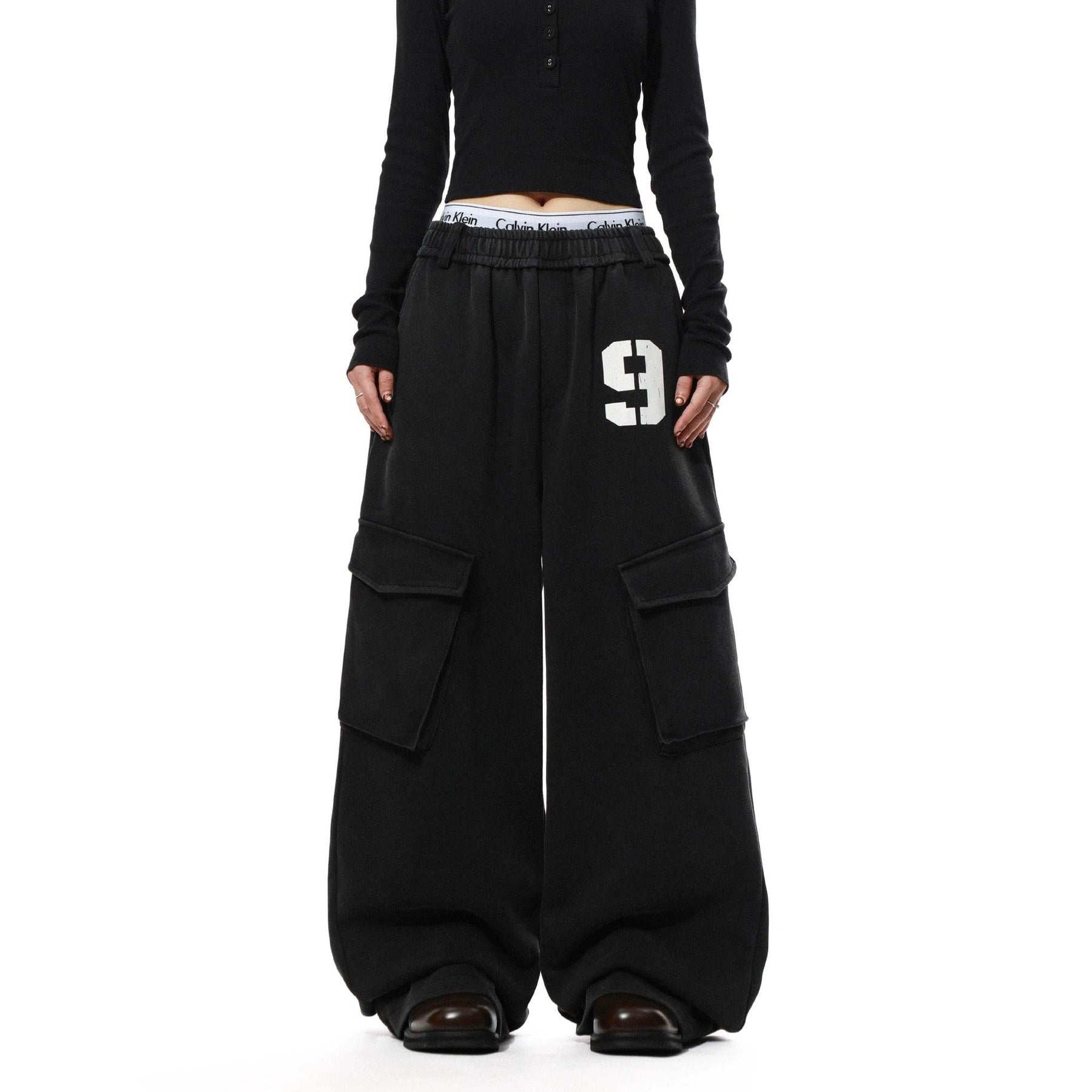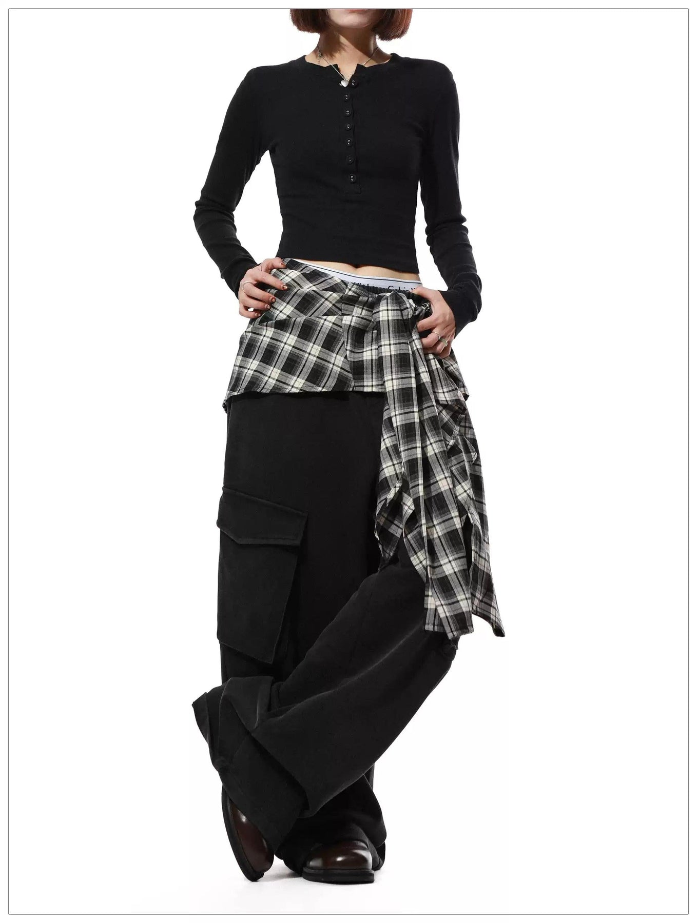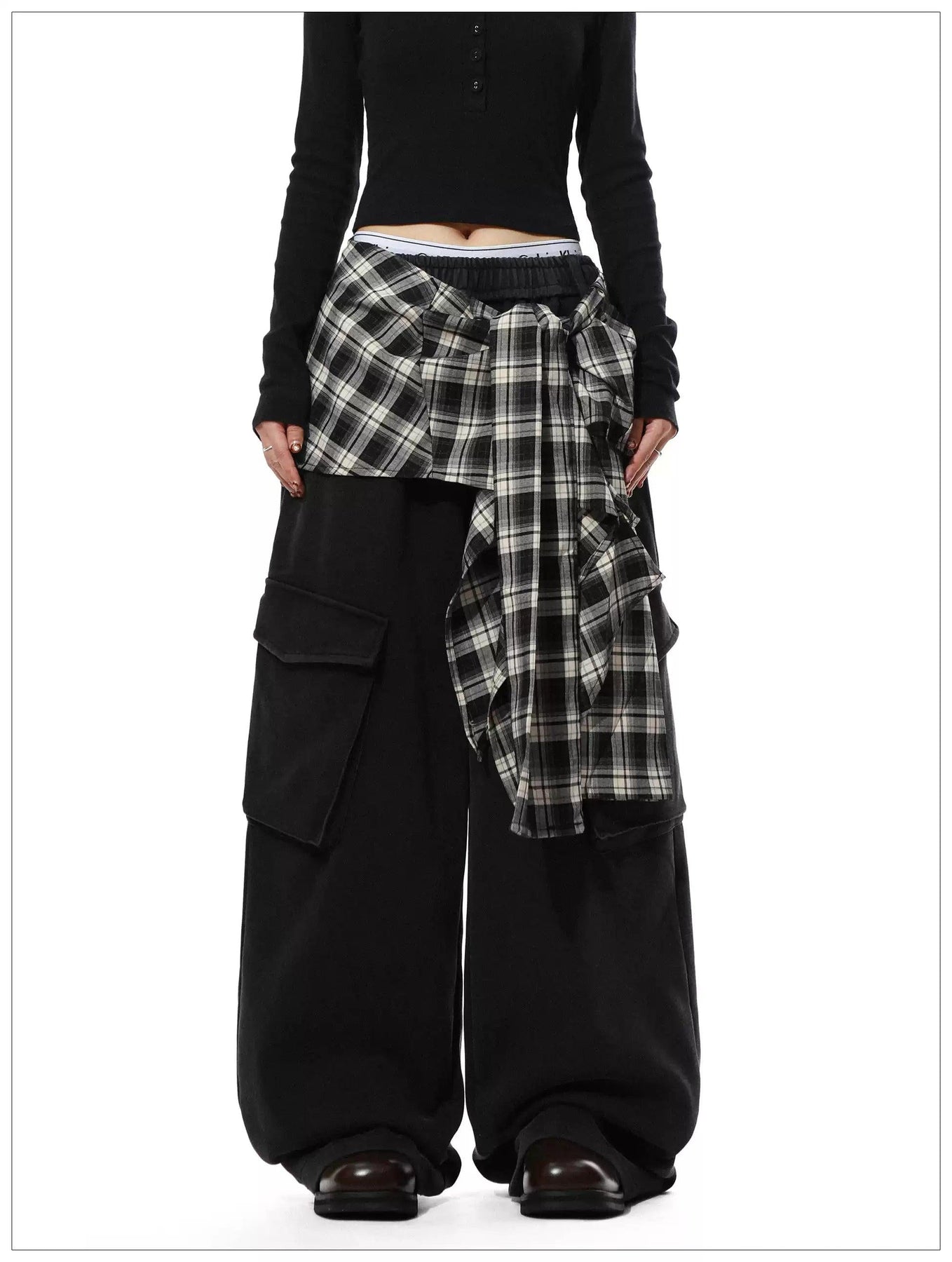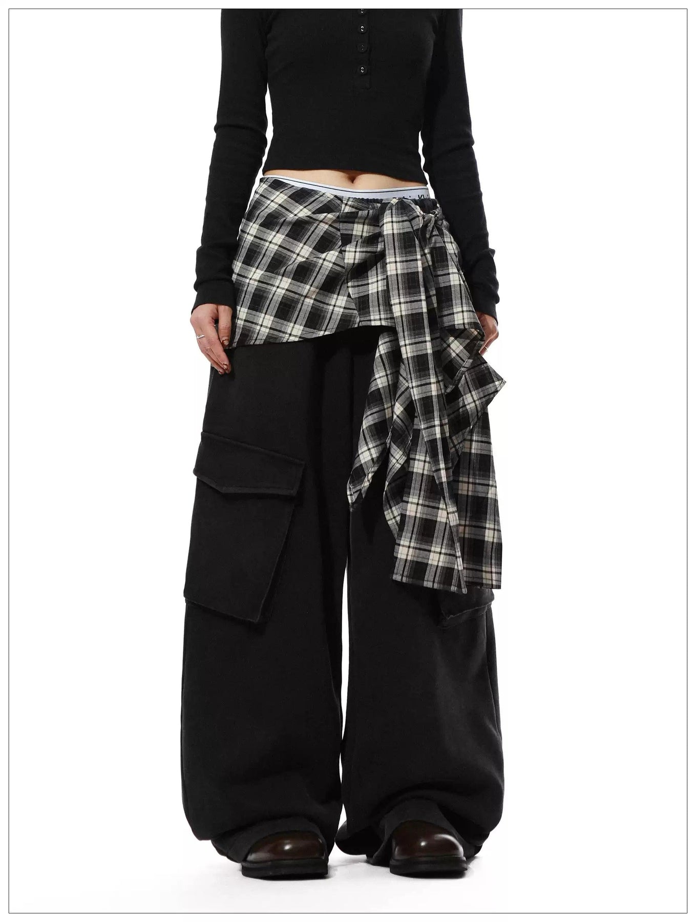 Number Printed Plaid Layered Cargo Pants