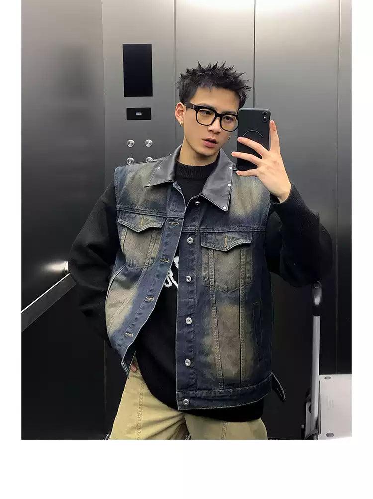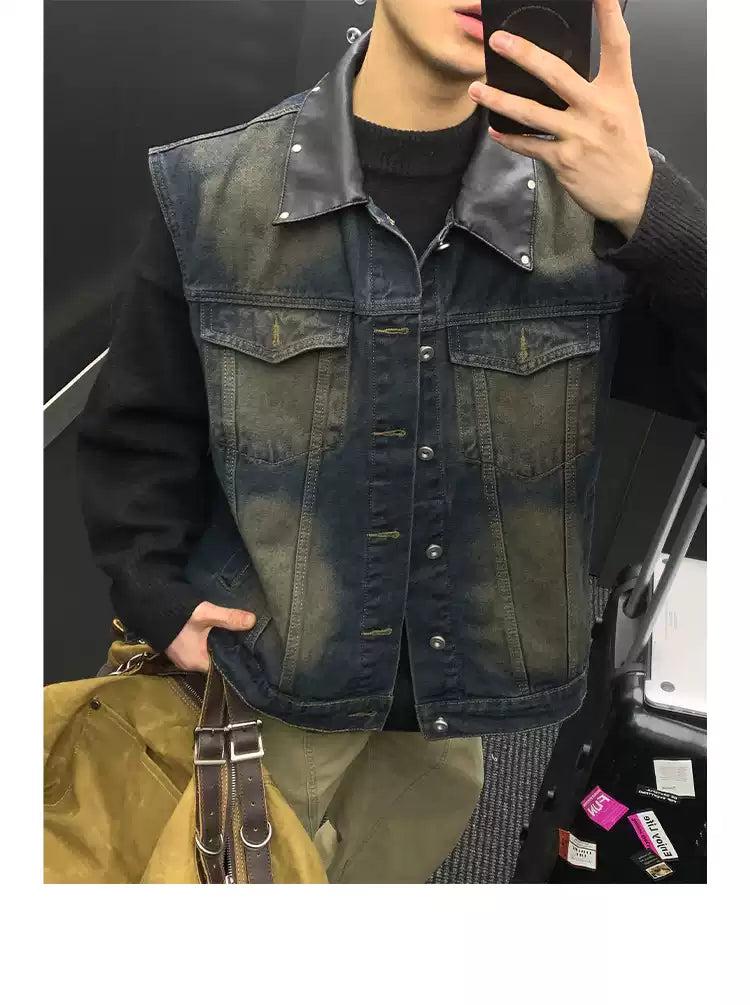 Washed Rivet PU Leather Collar Denim Vest