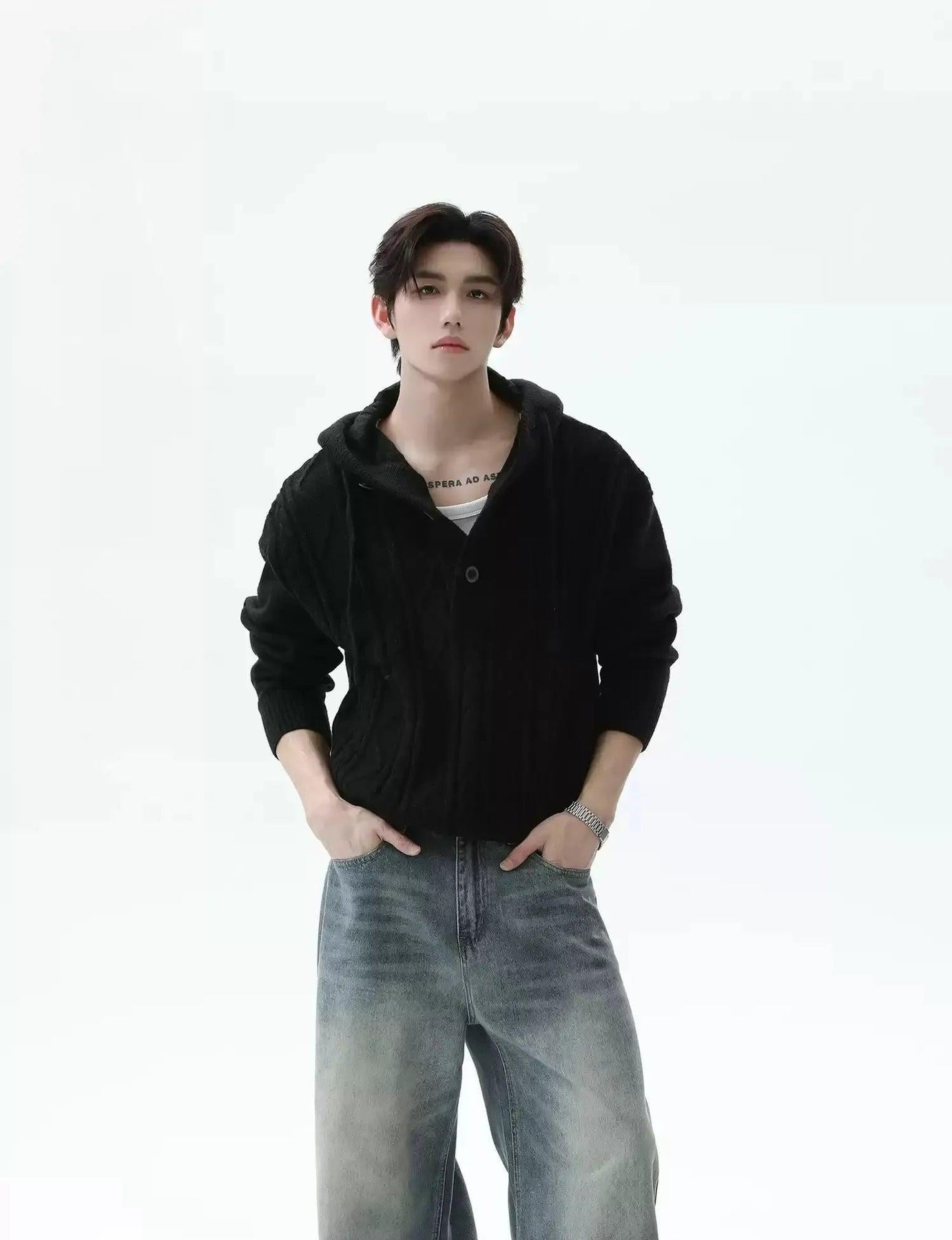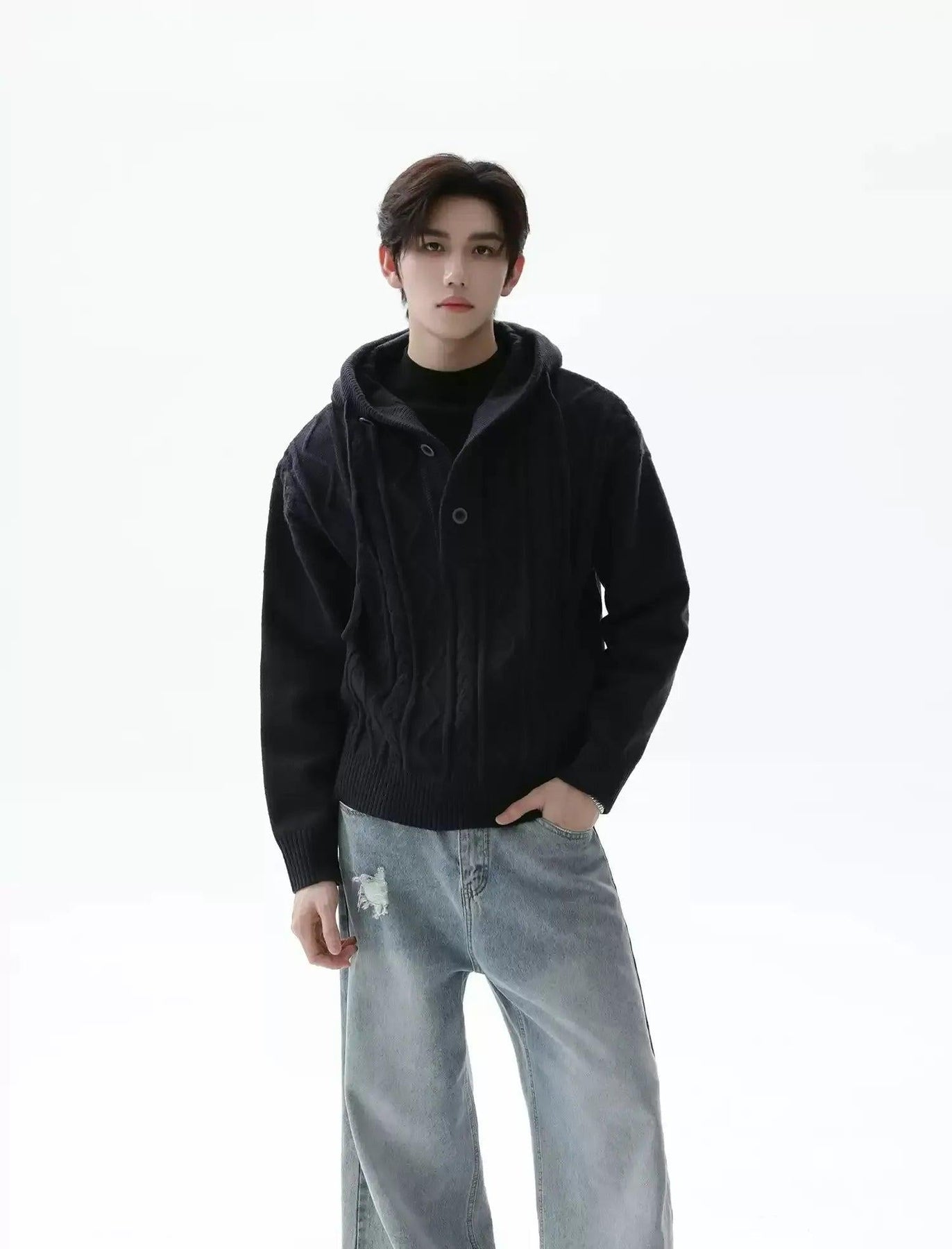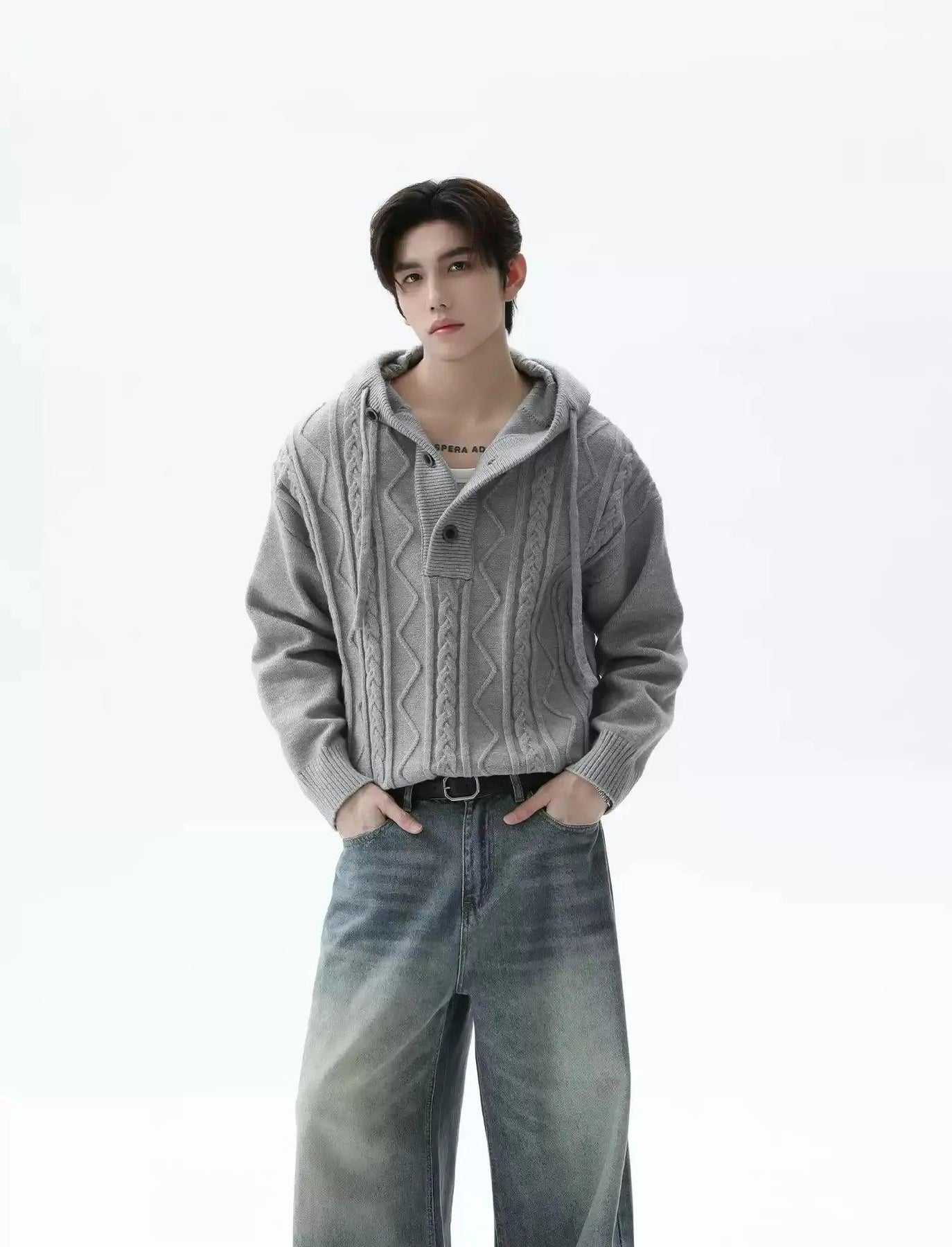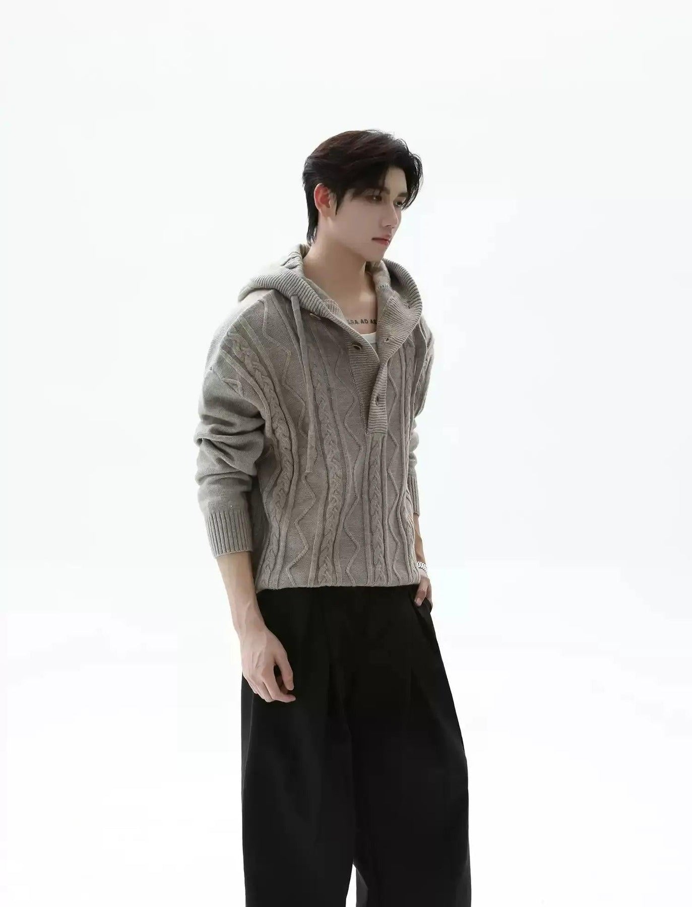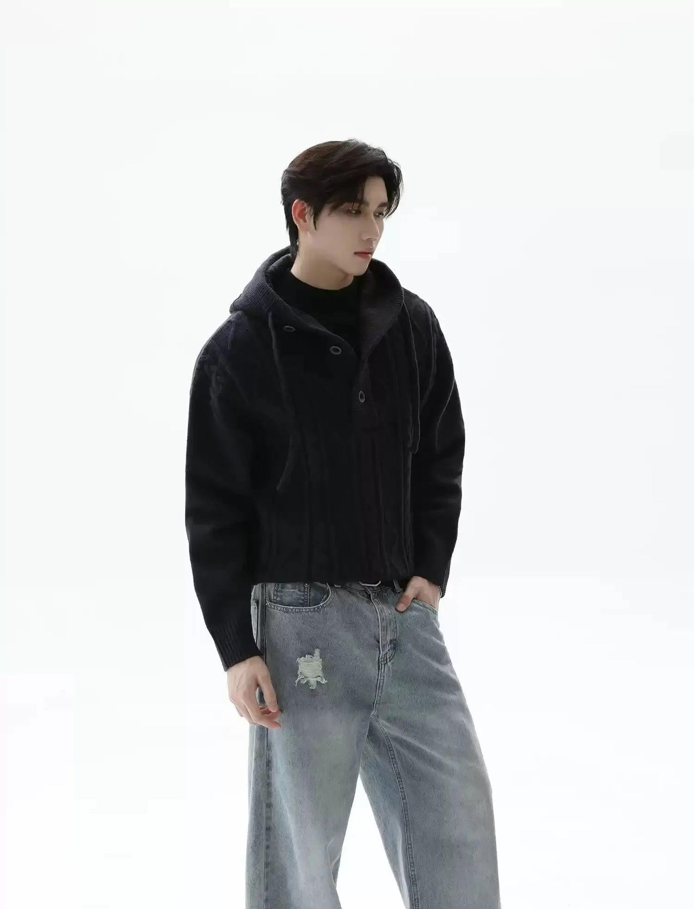 Pattern Knit Half-Button Hood Sweater